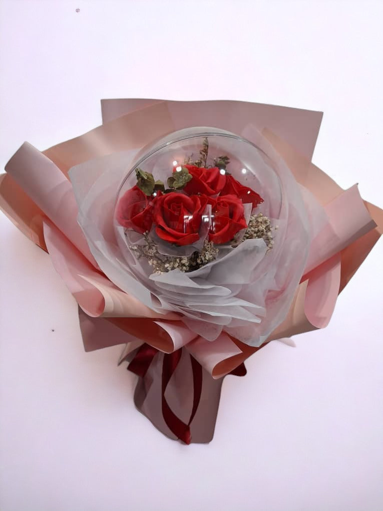 5 Soap Rose Flowers in an Acrylic Ball Bouquet + Dried Baby Breath & Dried Fillers
