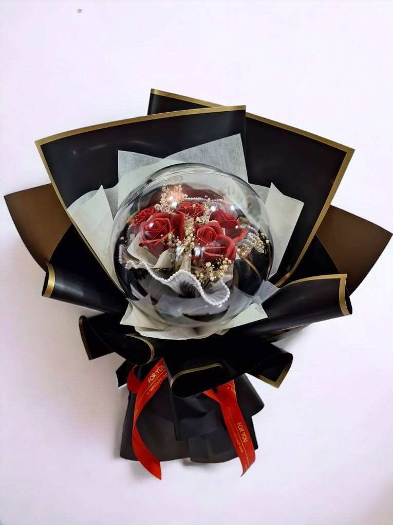 5 Soap Rose Flowers in an Acrylic Ball Bouquet + Dried Baby Breath & Dried Fillers